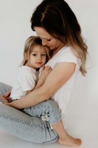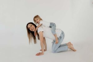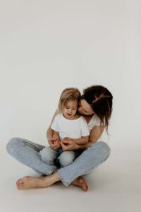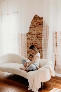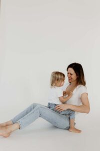 Motherhood sessions can happen anywhere — in your home, outdoors, or in a beautifully lit studio like this one. What matters most is capturing the connection you share with your child.
